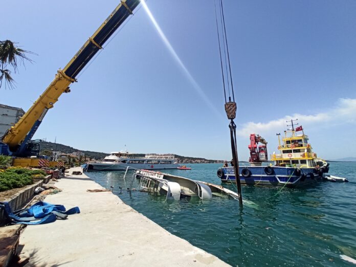 Ayvalık'ta 21 Mayıs sabahı yaşanan fırtınada batan gezi teknelerinin denizden çıkartılması için çalışmalar devam ediyor.